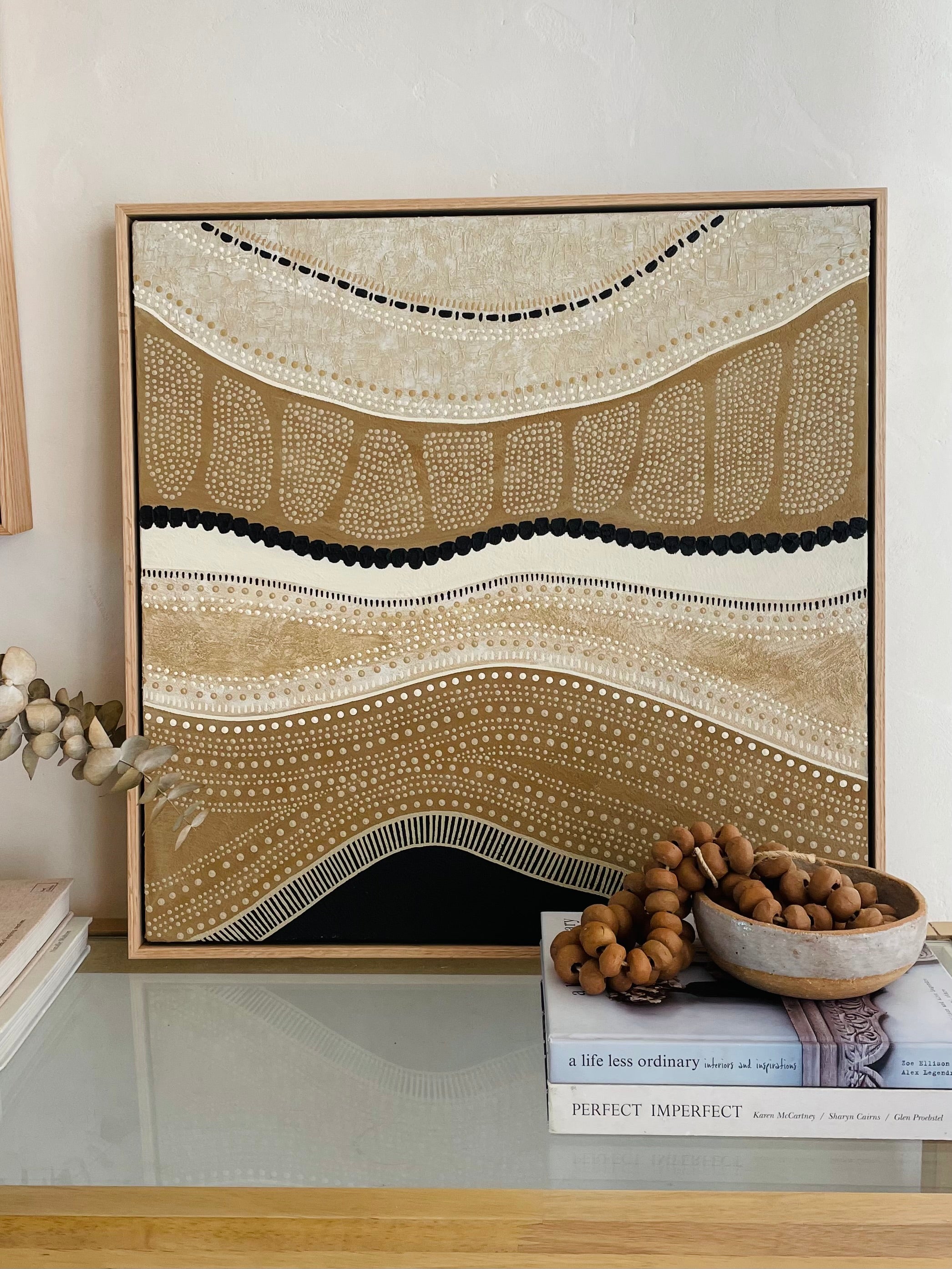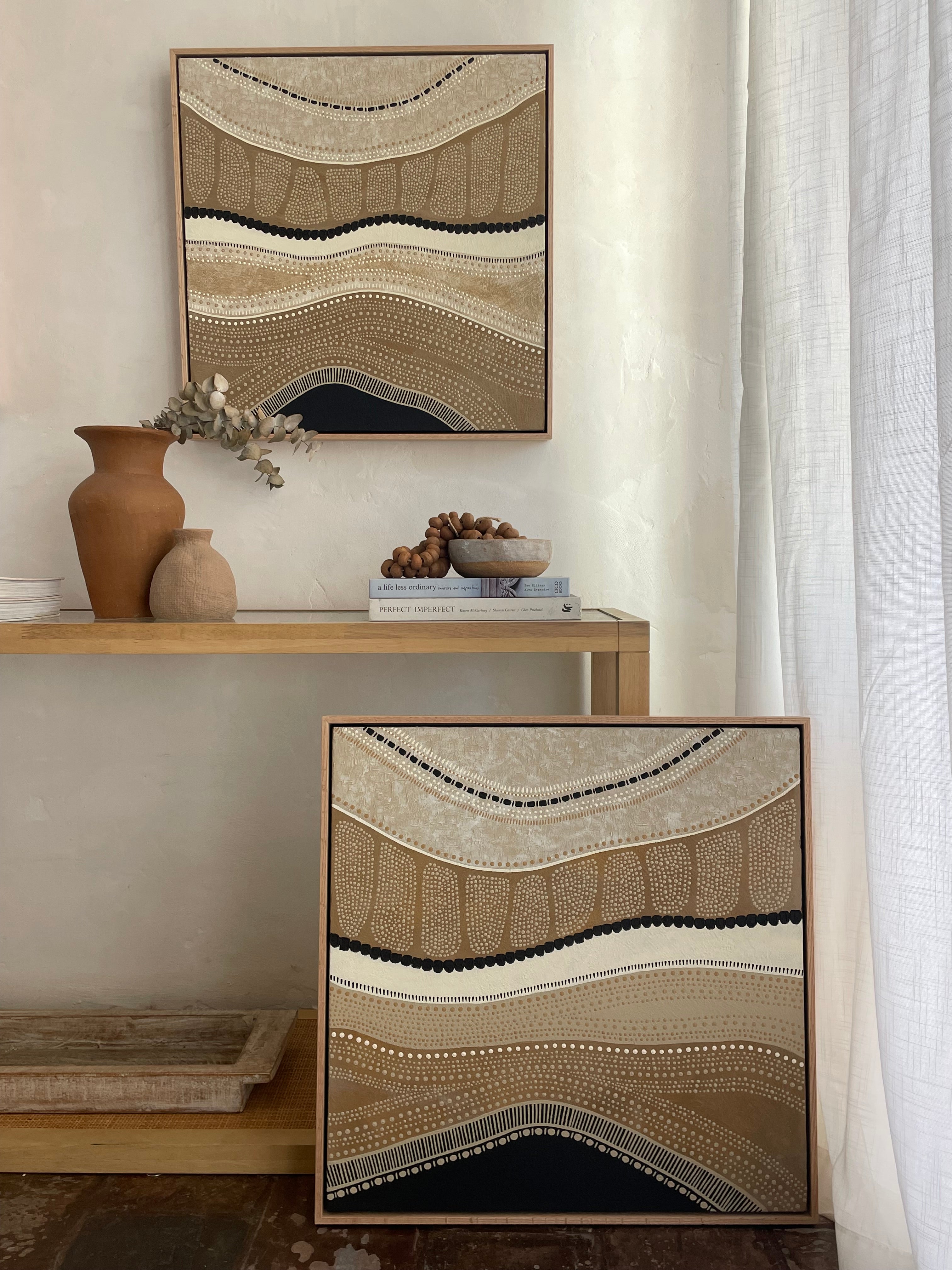 Of Earth is inspired by the sandstone cliffs on both Wiradjuri & Awabakal Country. The beautiful textures and blended tones of the sandstone met with the sharp contrast of the coal seams. Each layer of the earth formed by the elements over thousands of years. Each layer changing with time. The heavily textured mediums create depth and mimic the rawness of the landscape.600 x 600mm framed in Oak
