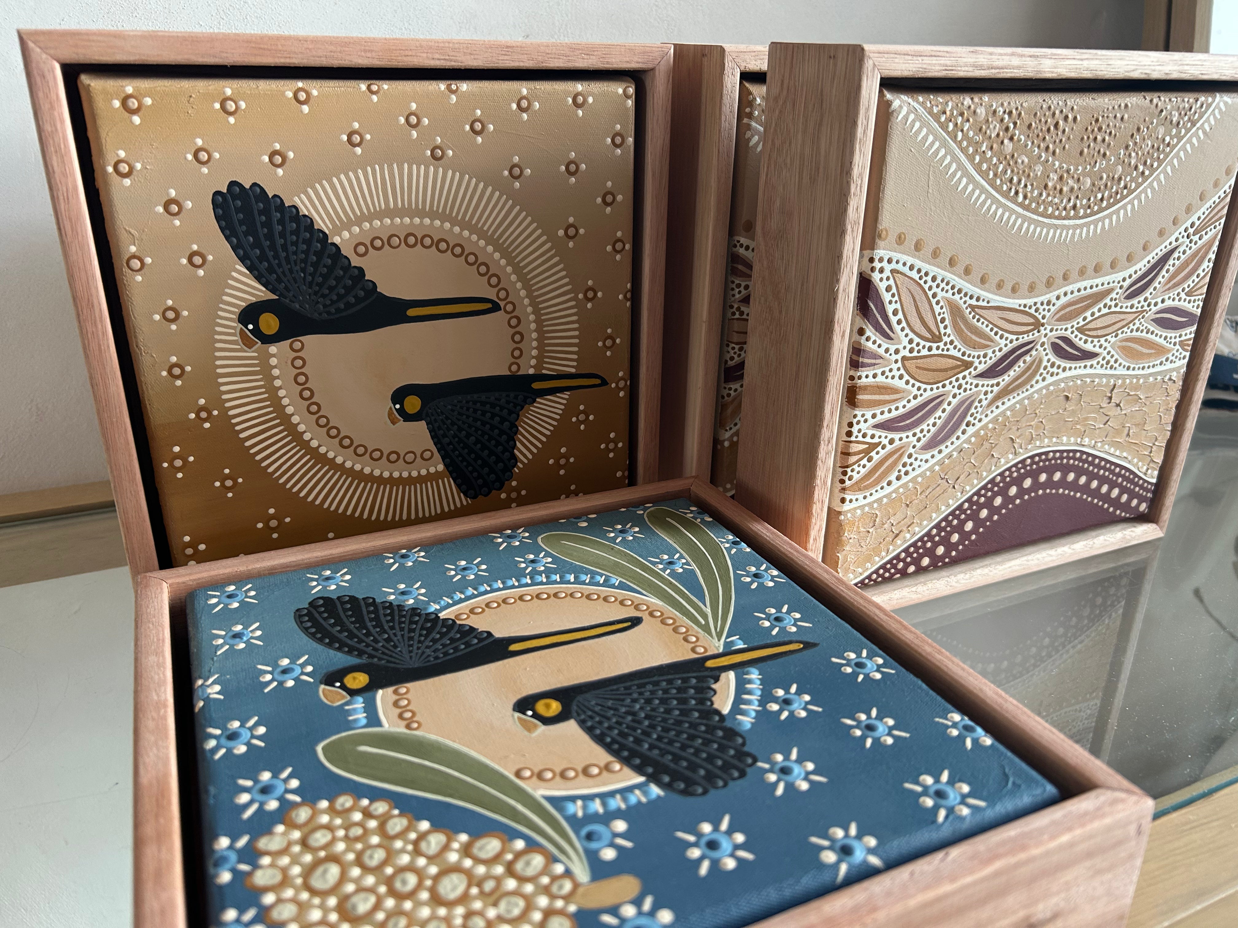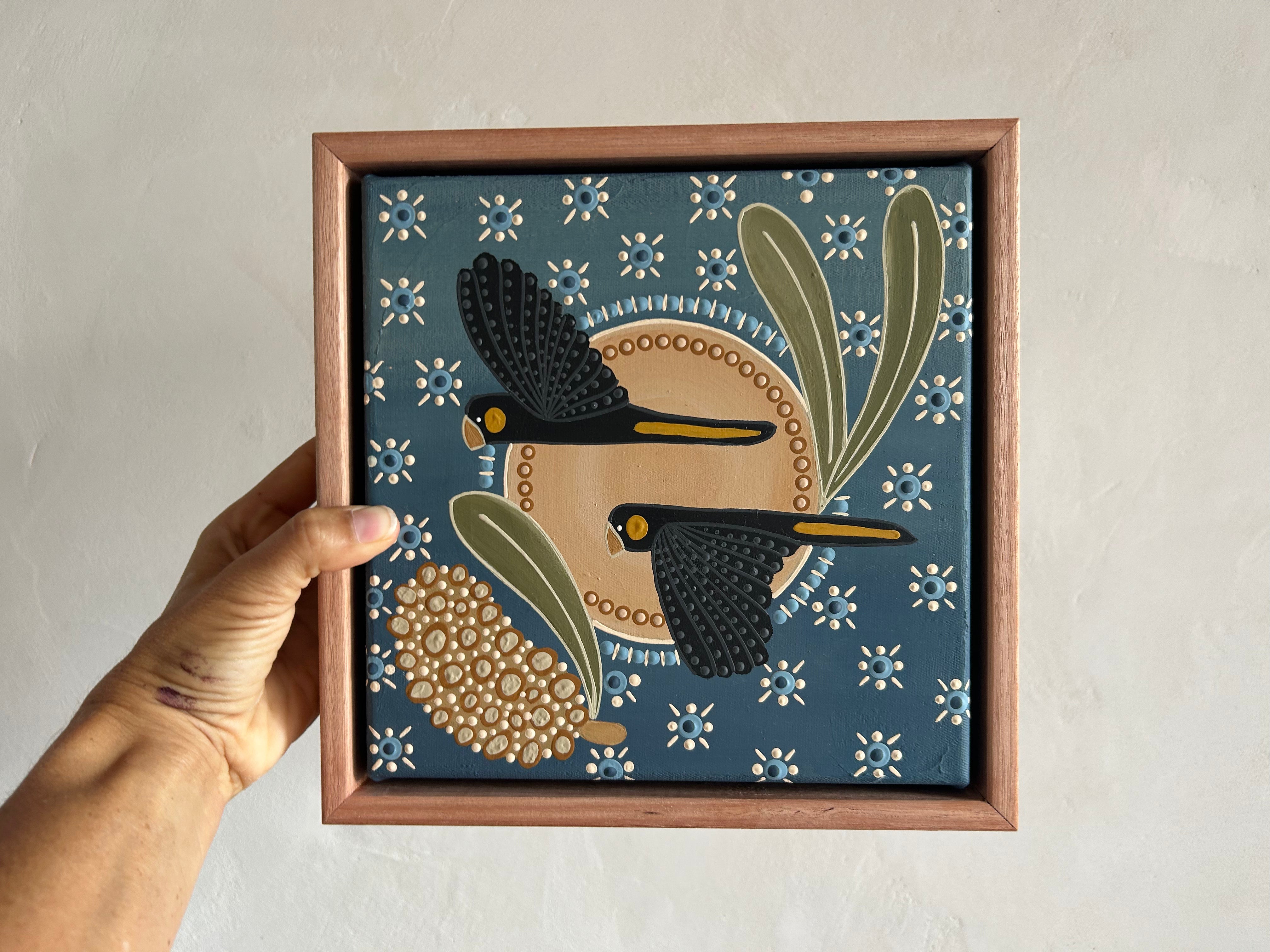 Inspired by our precious Black Cockatoos (Biliir) watching, protecting, and carrying story across Country. They embody a deep sense of connection, guidance, and spirit.