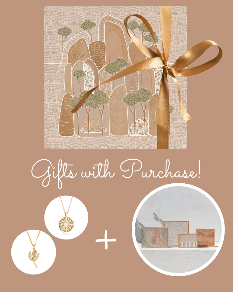 Inspired by the beautiful Wiradjuri landscape my GGrandparents called home. The colours of the bush met with the texture of the sandstone cliffs. The interesting shapes and line of the pagoda rock formations jutting out of the earth. Swimming in the river, open fires under the stars at night. Their presence is always with me but it feels extra special to be with them out here on Country.