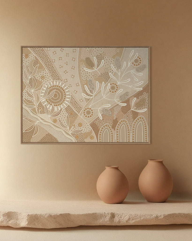 All stretched canvas artworks are framed with Tasmanain Oak. The frame features a shadow box gap, that sits between the frame and the canvas, giving the artwork a sophisticated floating appearance.